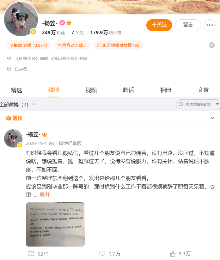 杨笠微博账号仅有一条2020年11月发布的置顶微博可见,该账号粉丝数为249万,转评赞共179.9万。