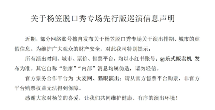 近期,部分网络账号擅自发布关于杨笠脱口秀专场关于演出排期、城市的虚假信息。为维护广大观众的财产安全,对此,我司特别提示:所有演出时间、城市、票价、售票平台,均以小红书账号“乐式贩卖机”发布为准。其它自称“独家”“内部”消息均属伪造,请勿轻信。